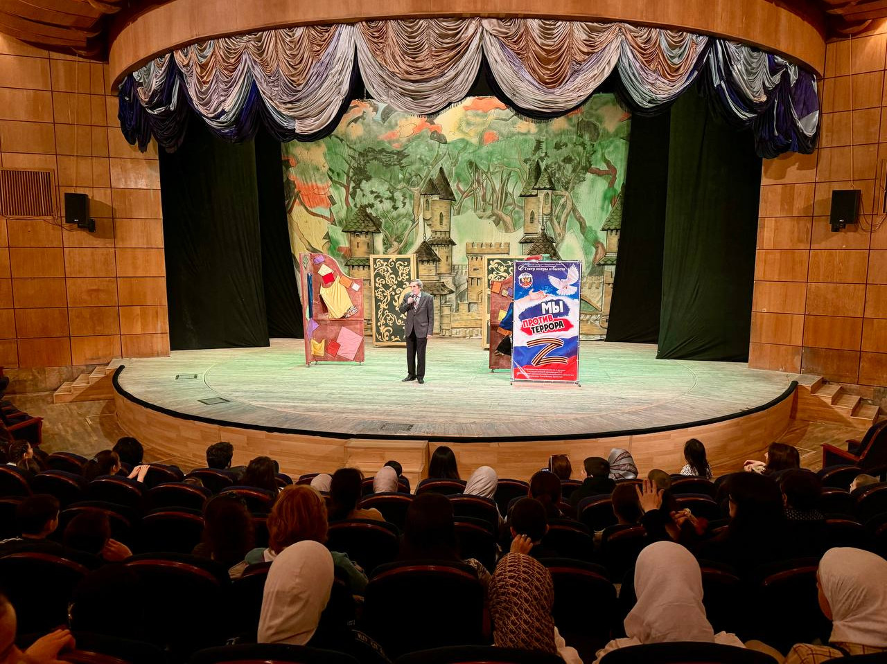 Перед началом спектакля, заместитель директора театра Заурбег Джанаев провел с детишками профилактическую беседу, направленную на неприятие идеологии экстремизма и его проявлении в социальной жизни, а также рассказал о наших земляках проявивших свое мужество и героизм в зоне СВО. Далее в исполнении солиста театра Сергея Позднякова для зрителей прозвучала музыкальная композиция о дружбе и любви к Родине.